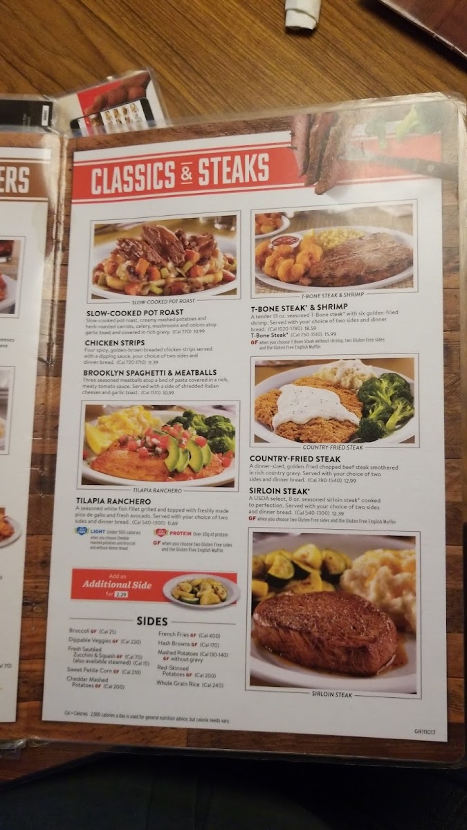 A USDA choice cut, 8 oz. seasoned sirloin steak.* Served with two sides and dinner bread.